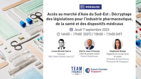 Lors de ce Webinaire, vous aurez l'opportunité d'écouter et de partager vos points de vue avec deux intervenants exclusifs : Lucas Nicolet-Serra (Counsel chez K&L Gates Straits Law LLC) et Pierre Jean-François (Chef de projets santé chez French Healthcare).