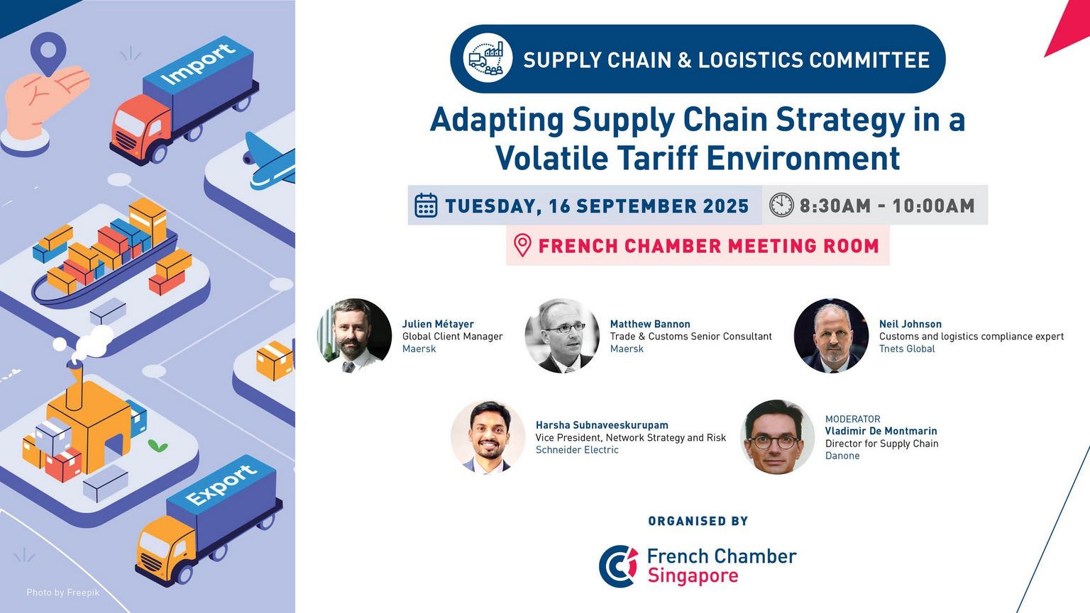 Our panel of corporate and consulting experts will share their perspectives on the regulatory landscape, risk management strategies, and practical steps to strengthen supply chain agility. Participants will gain insights into mitigating disruptions, optimising sourcing decisions, and building resilience to thrive in a complex global trade context.