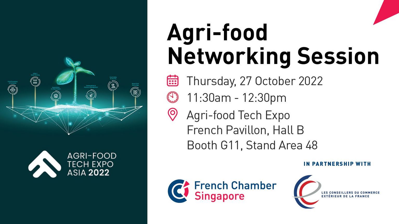 Join our French Pavillon during the Agri-food Tech Expo at the Sands Expo and Convention Centre, Marina Bay Sands, for a networking lunch session in the presence of Anne Denis-Blanchardon, Deputy Head of Mission, French Embassy in Singapore along with our exhibitors and partners: Amarenco, BLU EAT and Ubees, BioCeanor, Axioma France, Phagos, Pure Active Water under the patronage of The French Foreign Trade Advisors .