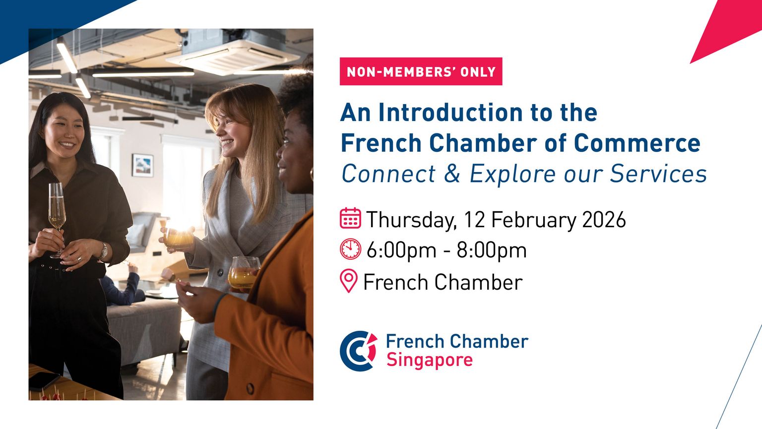 Join us for an exclusive Open House at the French Chamber of Commerce in Singapore, where we invite non-members to discover our services and network in a convivial atmosphere!