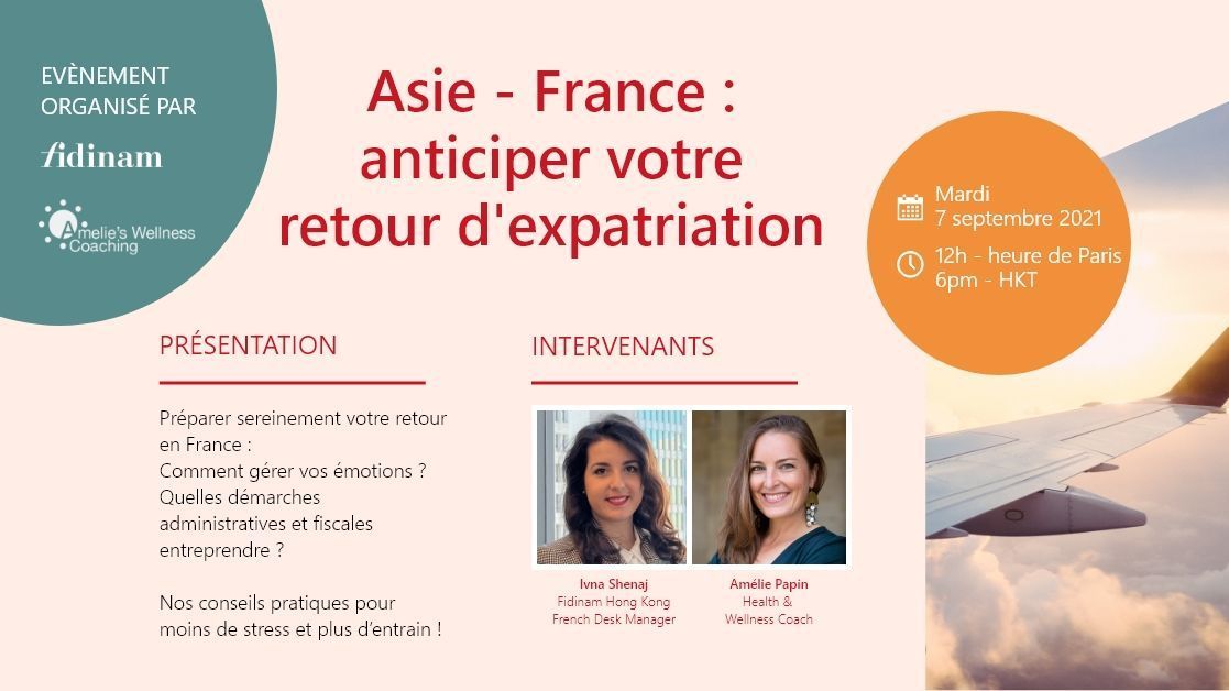 Rejoignez-nous pour un webinaire en francais dédié. Les intervenants de Fidinam et Amelie's Wellness Coaching partageront leurs conseils pratiques et astuces afin d’anticiper un retour en France avec moins de stress et plus d’entrain !