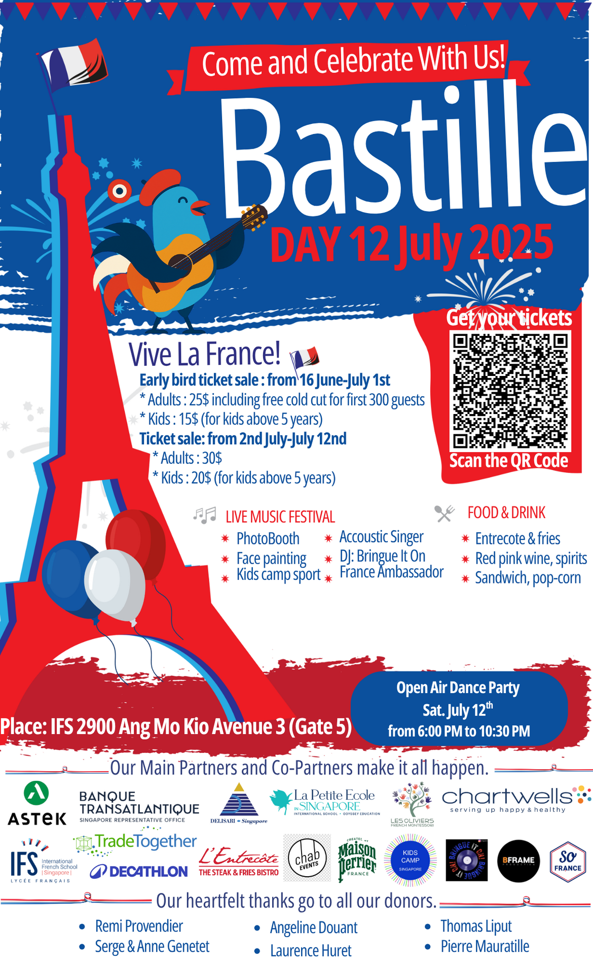 The Bastille Day 2025 – French Community is organized under the initiative of the Conseiller des Français de l’Étranger de Singapour and with the support of the French Embassy in Singapore, in close collaboration with the wider French community and its active network of associations and volunteer groups. The event reflects the vibrant and diverse fabric of the French presence in Singapore, bringing together families, entrepreneurs, professionals, students, and friends of France for an evening celebration of community and culture.