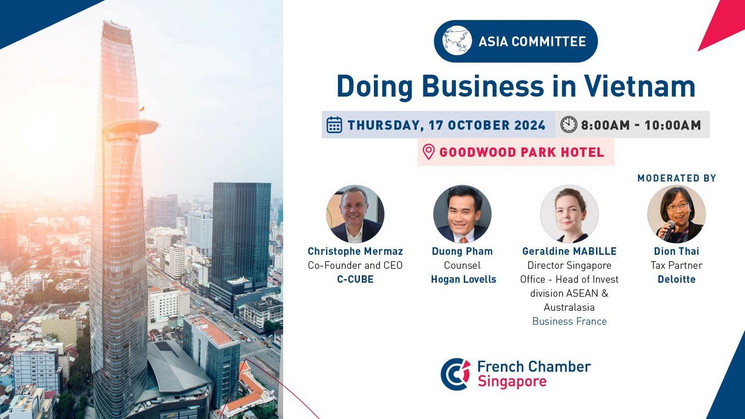 Are you a French or Singaporean company or entrepreneur eyeing expansion opportunities? Vietnam, often dubbed "China's backyard", is rapidly emerging as a manufacturing powerhouse. This exclusive breakfast talk "Doing Business in Vietnam" will provide you with the essential knowledge and connections to successfully navigate the Vietnamese market.
