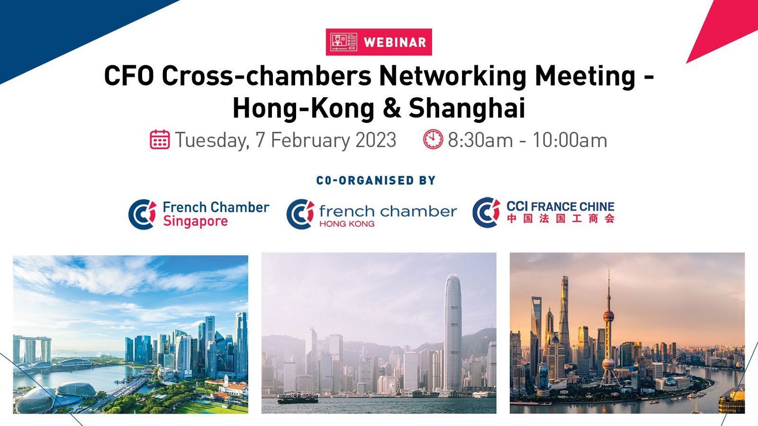 The French Chambers of Singapore, Hong-Kong and Shanghai are pleased to invite you to join an online discussion with your CFO peers on Tuesday 7th of February 2023 from 8:30am to 10am (SG time).