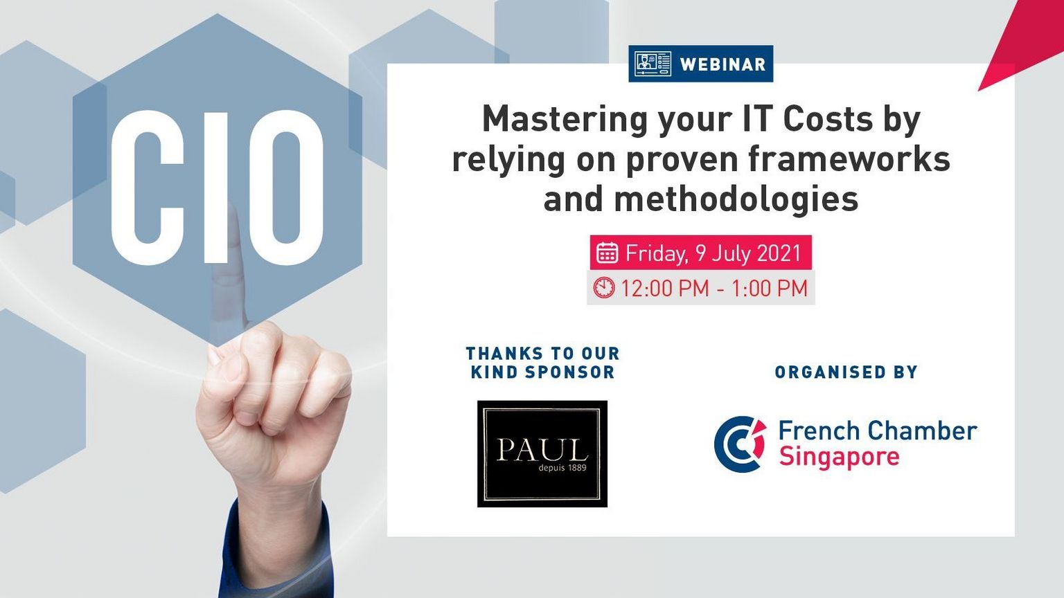Together with the co-presidents of the CIO Club, Christel Vache (Total Oil Asia-Pacific) and Thomas Darbois (Bollore Logistics), we are pleased to invite you to an interactive and online session on the topic "Mastering your IT Costs by relying on proven frameworks and methodologies" animated by Cedric Dufour, Head of IT Optimization at Optimal Cost and Joachim Treyer, CEO at Valoptia.