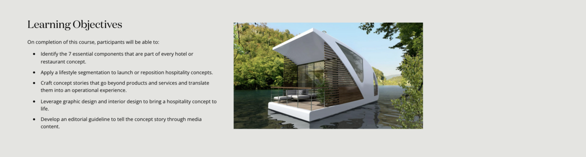 - Learn how to design and develop a successful hospitality concept - from the strategic and creative level down to the day-to-day operations.
