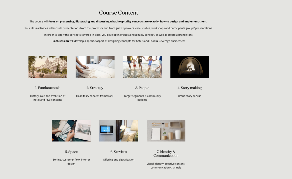 The course will focus on presenting, illustrating and discussing what hospitality concepts are exactly, how to design and implement them.