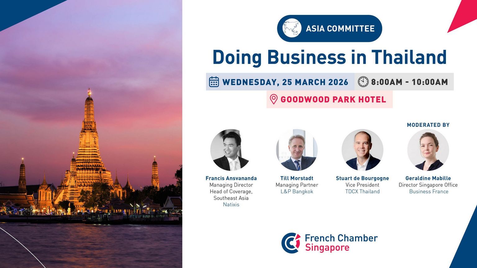 Are you a French or Singaporean company or entrepreneur eyeing expansion opportunities? This exclusive breakfast talk "Doing Business in Thailand" will provide you with the essential knowledge and connections to successfully navigate the market in Thailand.