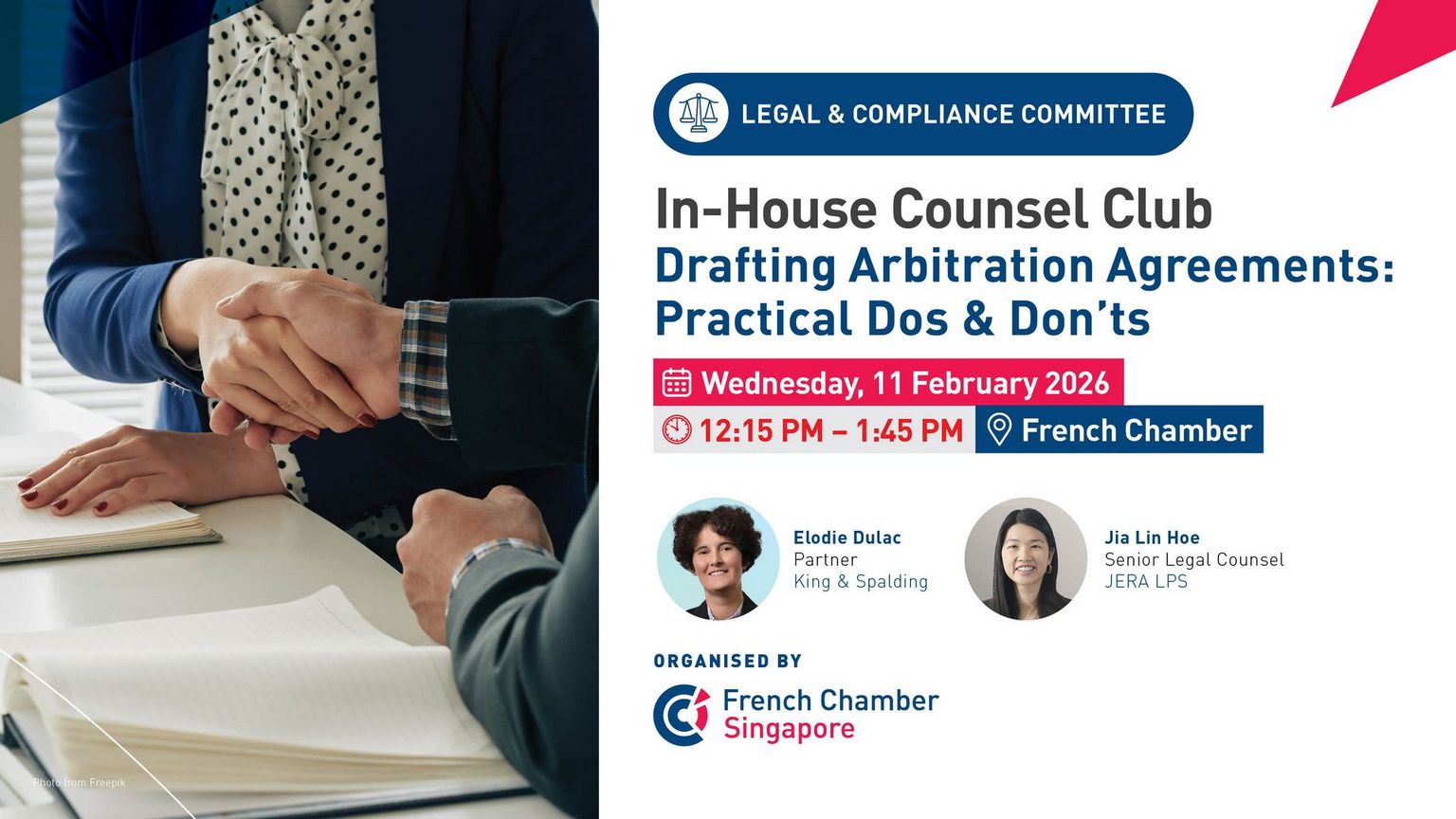 This session, led by Elodie Dulac, Partner at King & Spalding and Jia Lin Hoe, Senior Legal Counsel, JERA LPS, will provide you with a practical overview of the key considerations in drafting effective arbitration agreements and ensuring an effective dispute resolution mechanism in our cross-border contracts. Topics to be covered include: