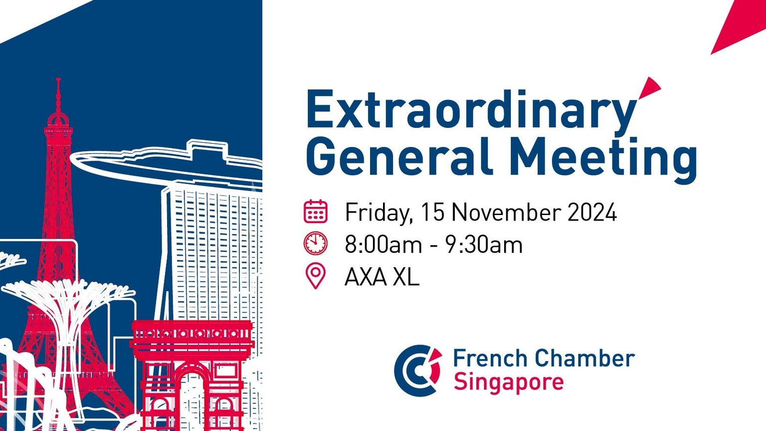 NOTICE IS HEREBY GIVEN that an Extraordinary General Meeting (“EGM”) of the French Chamber of Commerce in Singapore (“FCCS”) will be held on Friday, 15 November 2024 at 8:00 a.m. at AXA XL - 138 Market Street - #10-01 CapitaGreen, Singapore 048946, to transact the following business: