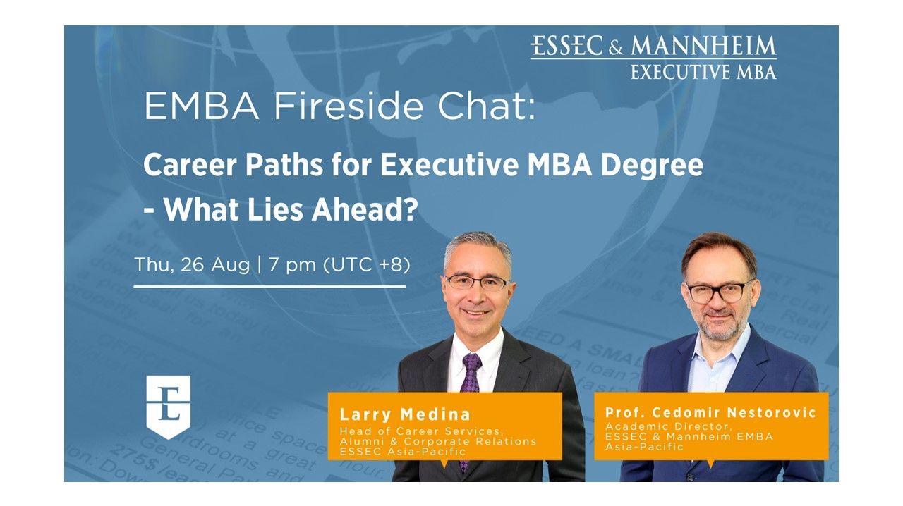 Join the EMBA Fireside Chat with Larry Medina, Head of Career Services, Alumni & Corporate Relations at ESSEC Asia-Pacific to discuss on the new career opportunities in the current job market for EMBA graduates. The dialogue will be moderated by Prof. Cedomir Nestorovic, Academic Director of the ESSEC & Mannheim EMBA Asia-Pacific program.