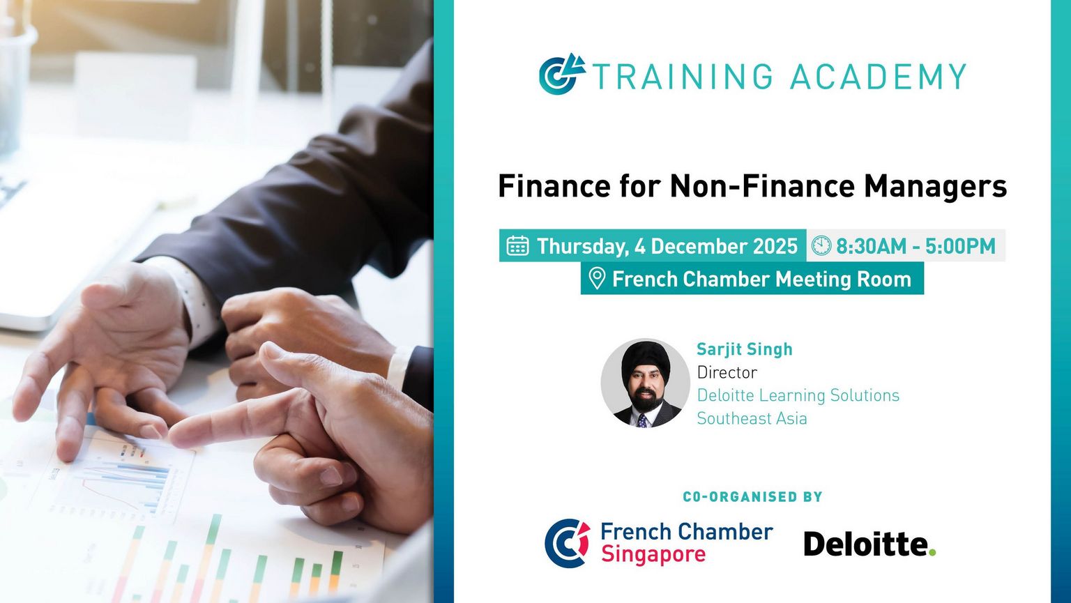 This practical, one-day program, headed by Sarjit Singh, Director at Deloitte Learning Solutions SEA, demystifies finance for professionals without a financial background. It equips participants with the essential concepts, tools, and language of finance so they can understand financial reports, interpret key numbers, and make more informed business decisions. Using simple frameworks, case studies, and hands-on exercises, the session builds confidence to engage with finance colleagues and contribute to organizational success.
