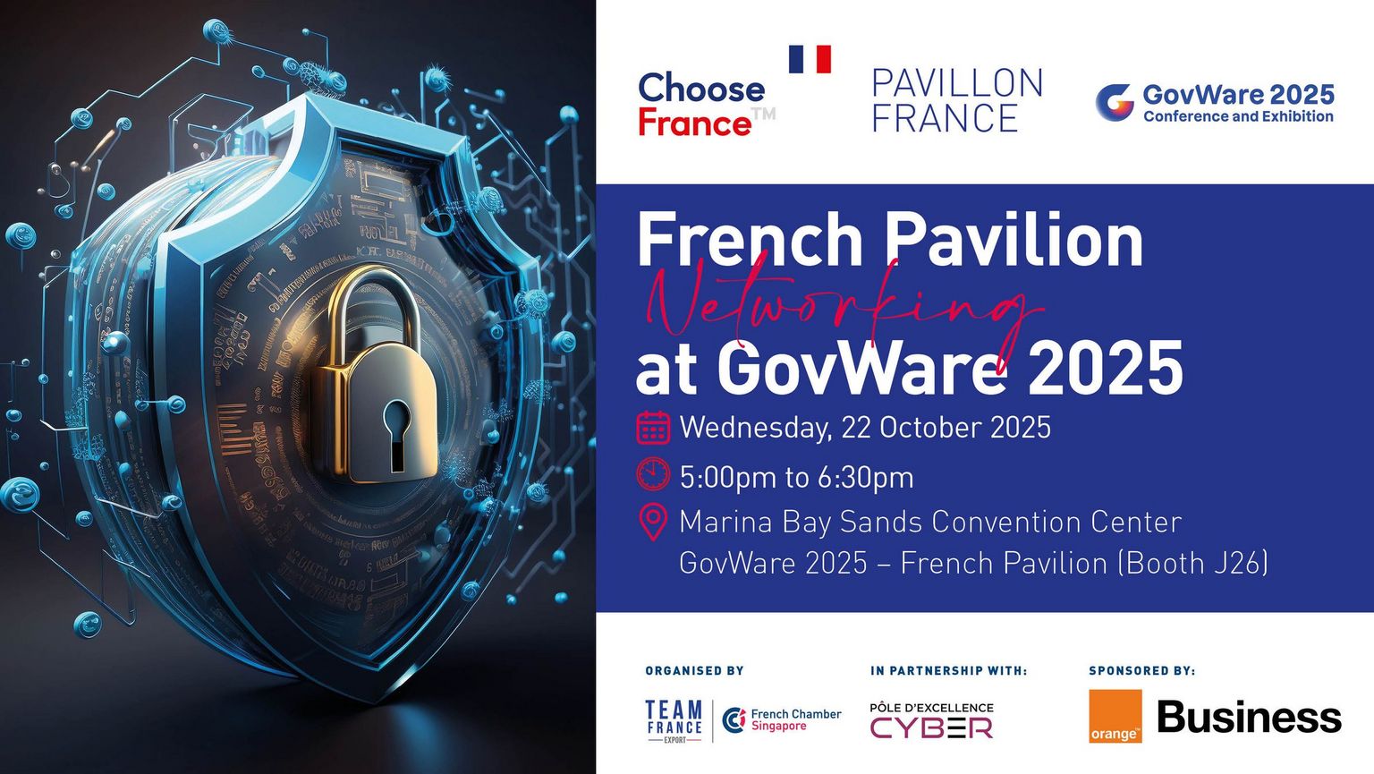 As part of GovWare 2025, the French Chamber of Commerce in Singapore, in partnership with Pôle d'Excellence Cyber, is hosting a networking event at the French Pavilion on Wednesday, October 22nd. This event is sponsored by Orange Business.