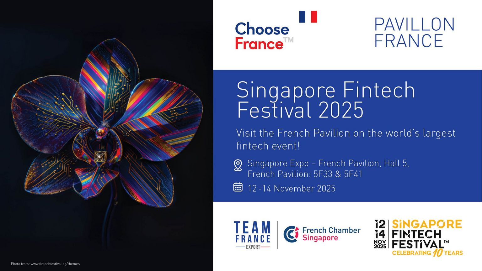 We are thrilled to invite you to visit the French Pavilion, organized by the French Chamber of Commerce in Singapore, at the 10th edition of the Singapore FinTech Festival from 12 to 14 November 2025 at Singapore EXPO. This year marks a decade of innovation, and Pavilion France is ready to impress!