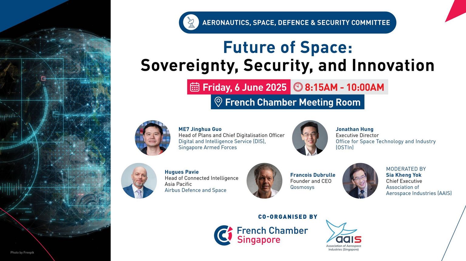 The Association of Aerospace Industries (Singapore) and the French Chamber of Commerce in Singapore are delighted to collaborate on an event titled "Future of Space: Sovereignty, Security and Innovation".