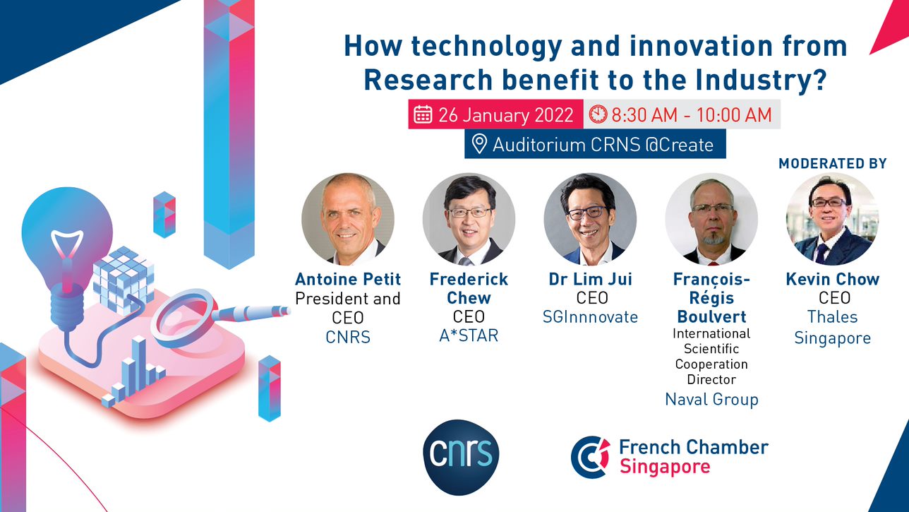 On that occasion, join us for a fruitful dialogue with Prof. Antoine Petit, Chairman & CEO of the CNRS France, Mr Frederick Chew, CEO of A*STAR and Dr Lim Jui, CEO of SGInnovate, to hear how Technology and Research agencies drive mission-oriented research and transfer research and innovation to private companies and industries.