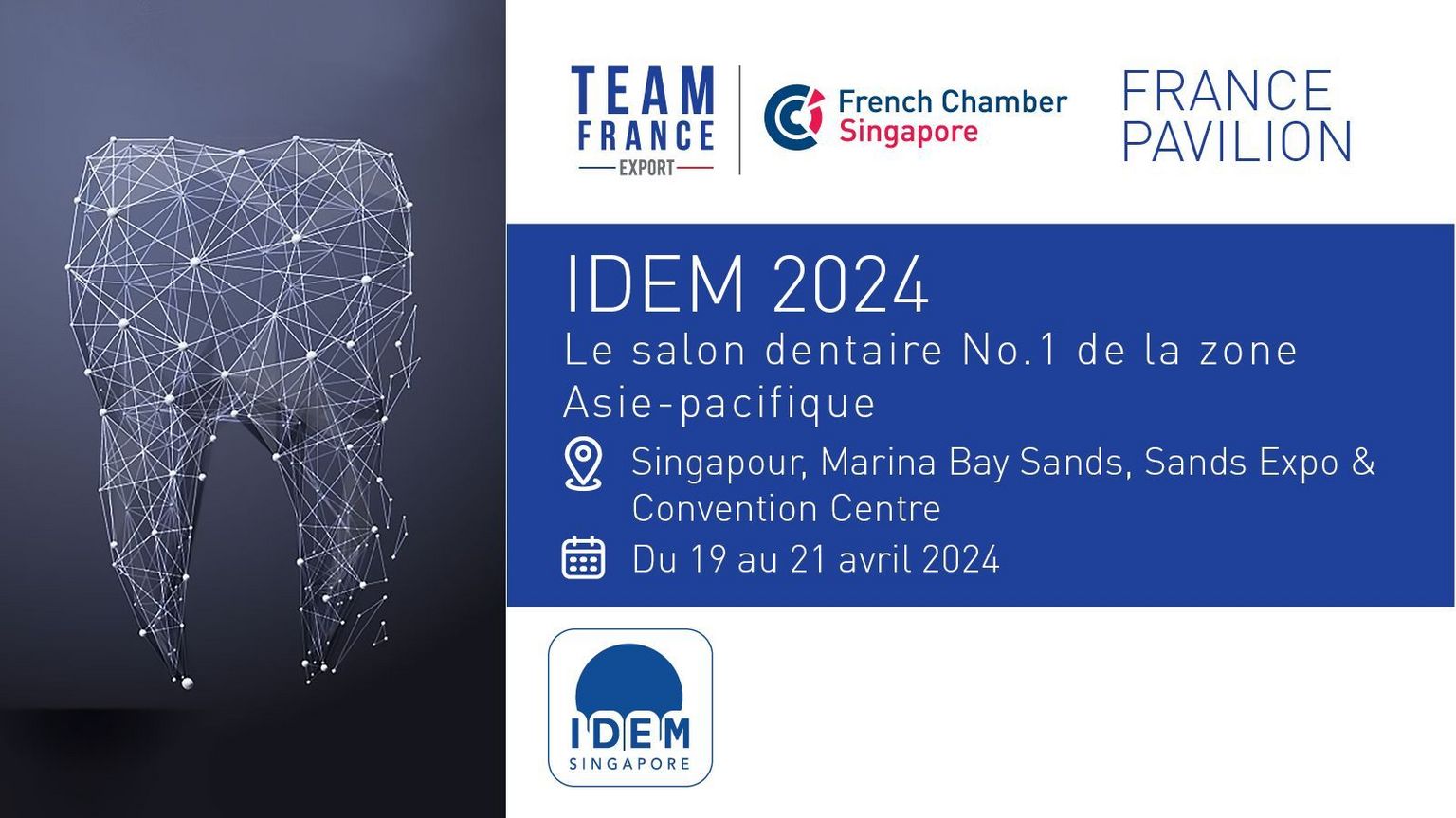 La 13ème édition du salon IDEM se tiendra du 19 au 21 avril 2024 au Marina Bay Sands Exhibition Centre à Singapour. Cet événement majeur de l'industrie dentaire en Asie réunit praticiens, fabricants, chercheurs et experts en santé bucco-dentaire.
