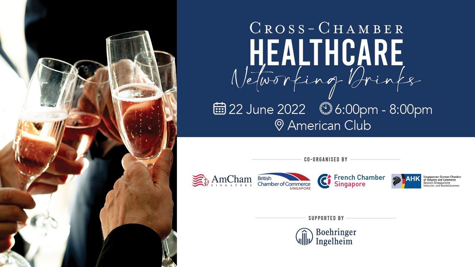 The AmCham, the British Chamber of Commerce, the French Chamber of Commerce and the Singaporean-German Chamber of Industry and Commerce are delighted to join forces to organise our first cross-chamber healthcare networking session.