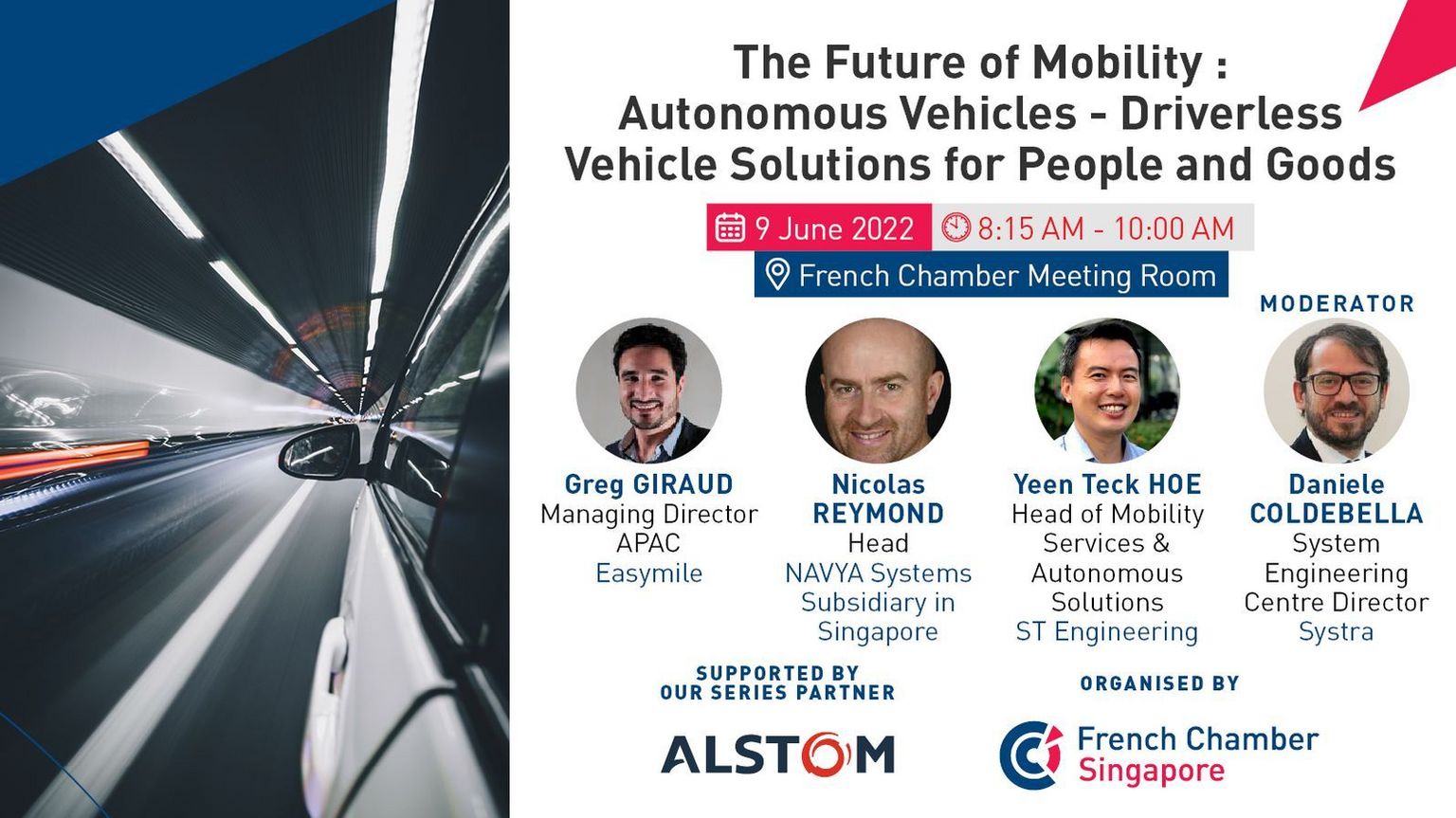 Join us on for a panel discussion on Autonomous Vehicles and Driverless solutions with Greg Giraud, Managing Director APAC for Easymile, Nicolas Reymond, Head of NAVYA Systems subsidiary in Singapore, and Yeen Teck HOE, Managing Director AV for ST Engineering.