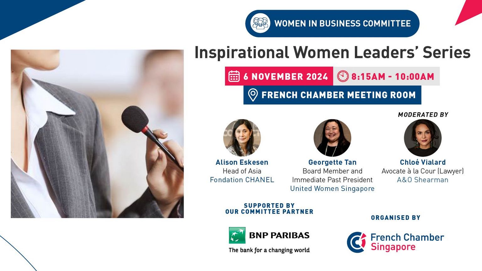 For this 13th edition, we are delighted to welcome Alison Eskesen, Head of Asia at Fondation CHANEL and Georgette Tan, Board Member and Immediate Past President at United Women Singapore who will share about their personal experience as executive leaders, with a specific focus on the non-profit and philanthropic sectors, and in providing resources and tools in support of women economic and social development.