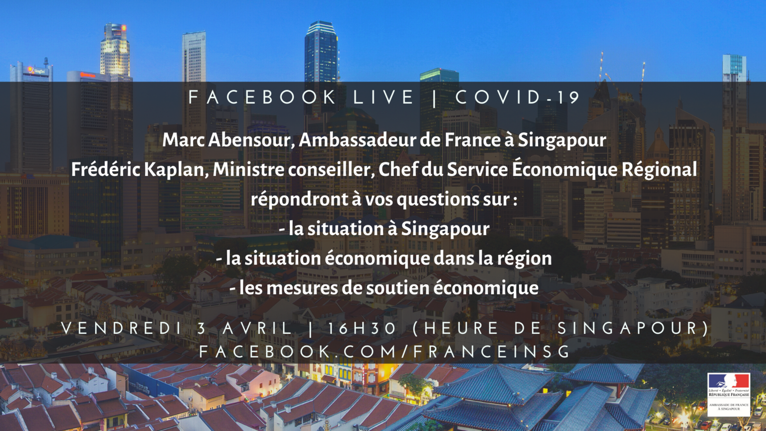 Rendez-vous le mercredi 15 avril à 11h00 (heure de Singapour) sur la page Facebook de l’Ambassade de France à Singapour