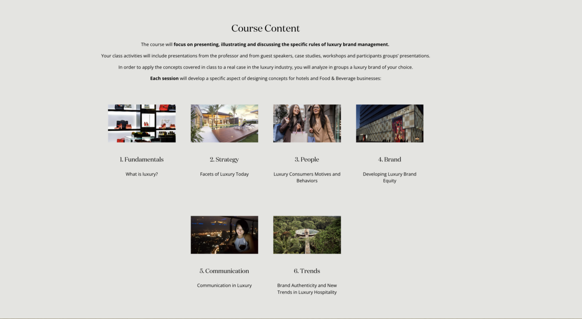 The course will focus on presenting, illustrating and discussing the specific rules of luxury brand management.