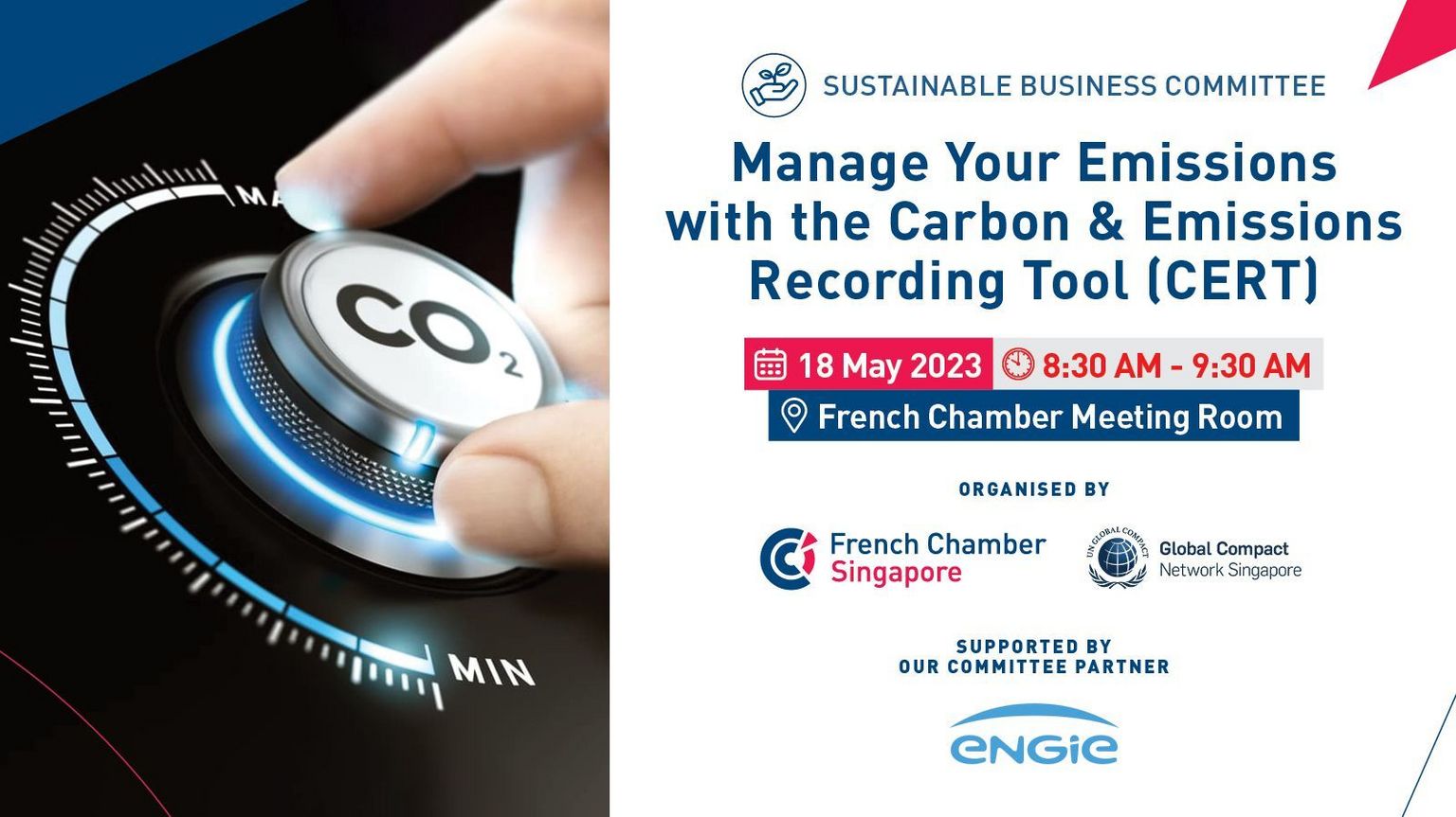 With Singapore's new ambitions to reach net-zero emissions by 2050, it has become more imperative for businesses to reduce their emissions and prepare themselves for a low-carbon future. The French Chamber of Commerce, as a member of the United Nations Global Compact, has invited the UN Global Compact Network Singapore (GCNS) to share how you can use their Carbon & Emissions Recording Tool (CERT) to track your emissions easily.