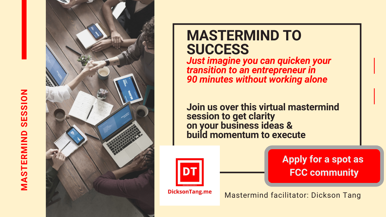 So don't miss out. Apply for a spot in this mastermind session. You will be able to secure a discount coupon (USD $100 off), specifically for FCC community.