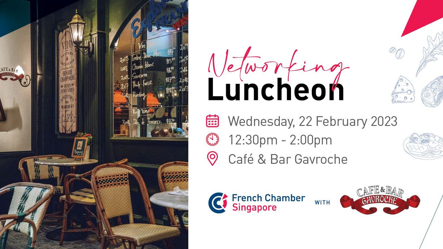 Come and join our Networking Lunch at Cafe & Bar Gavroche on Wednesday February 22nd, and enjoy an exquisite French lunch that will help broaden your network!