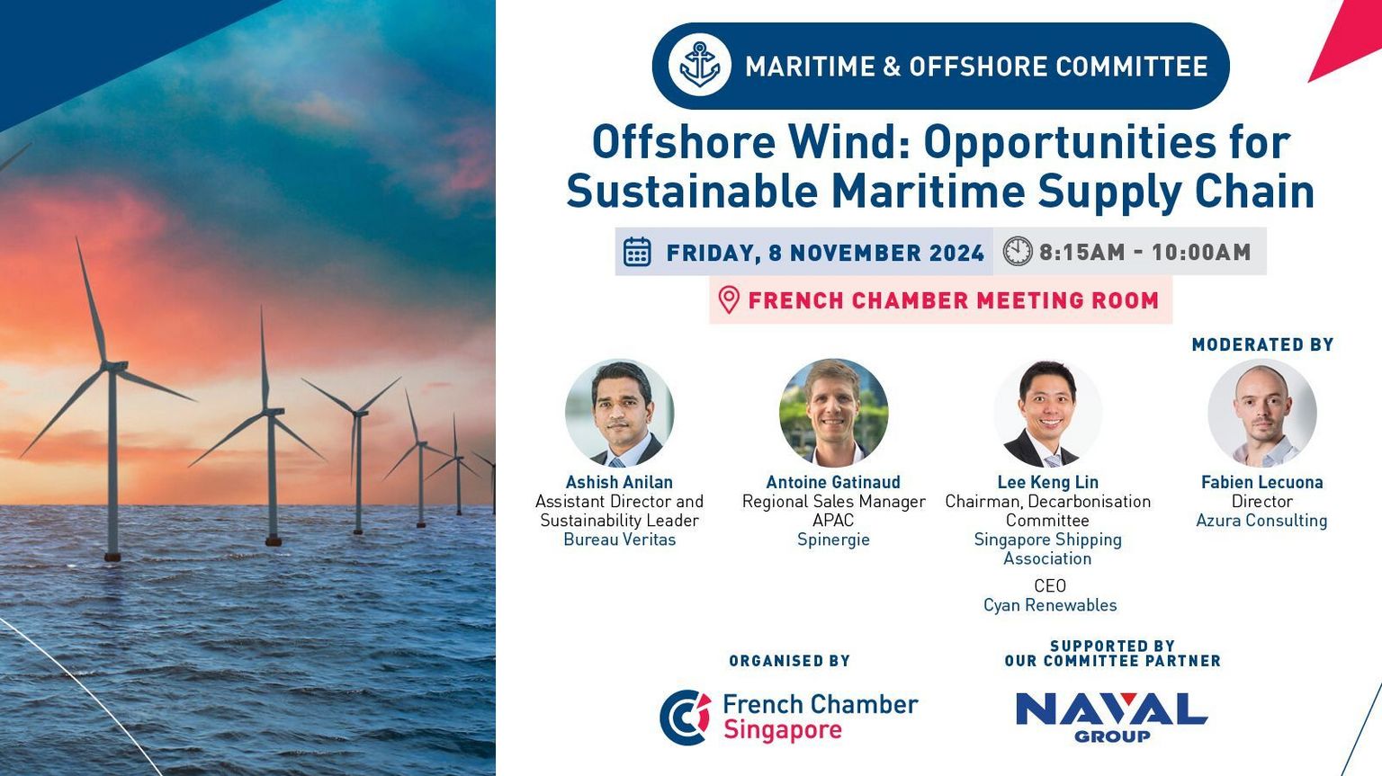 The French Chamber of Commerce in Singapore is delighted to invite you to our upcoming committee meeting on Offshore Wind - Opportunities for Sustainable Maritime Supply Chain.