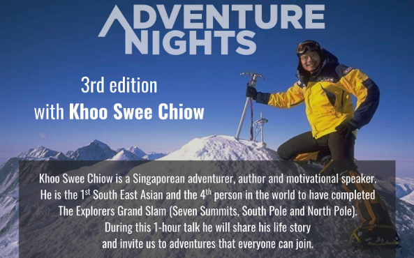 Khoo Swee Chiow is a Singaporean adventurer, author and motivational speaker. He is the 1st South East Asian and the 4th person in the world to have completed The Explorers Grand Slam (Seven Summits, South Pole and North Pole). During this 1-hour talk he will share his life story and invite us to adventures that everyone can join.