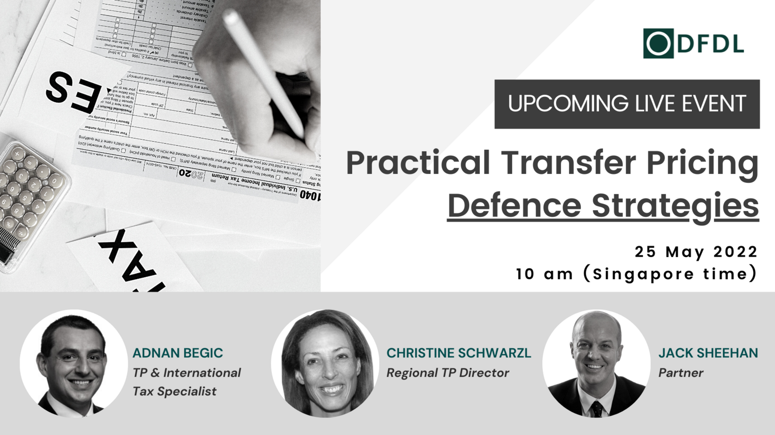 Please join us on Wednesday, 25 May 2022, at 10 am (Singapore time) for a live webinar on “Practical Transfer Pricing (“TP”) Defence Strategies”.