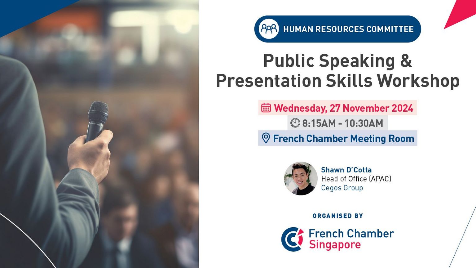 Mastering the art of public speaking and virtual presentations is essential for effective communication in today's professional world. This two-part workshop, led by Shawn D'Cotta, Head of Office at Cegos, provides participants with practical techniques to overcome nerves, enhance vocal delivery, and structure compelling presentations.