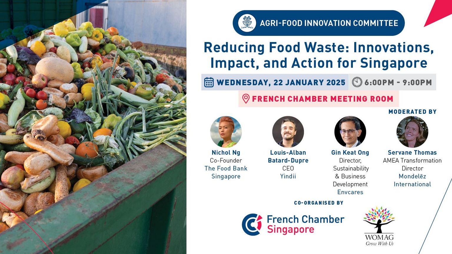 Singapore faces a pressing challenge with food waste, with approximately 800,000 tonnes discarded yearly, impacting both the environment and the economy. This event, co-organised by the French Chamber of Commerce in Singapore and WOMAG, will bring together industry experts and innovators to discuss sustainable and actionable solutions to combat food waste across the value chain—from production to consumption.