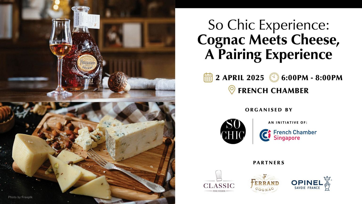 So Chic, in partnership with Ferrand Cognac, and Classic Fine Foods are thrilled to invite you to an exclusive tasting experience showcasing the perfect pairing of fine French cheeses and Ferrand Cognac.