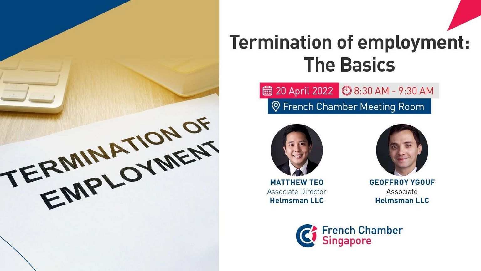 Join this in-person talk where our guests speakers will share their experience steering clients through the thorny issues arising from termination and dismissal of employees. They will discuss practical tips on what to look for in your employment contracts and guide you through the termination process to mitigate the risks of subsequent litigation. This will be a pithy, to the point, 1 hour seminar and Q&A session.