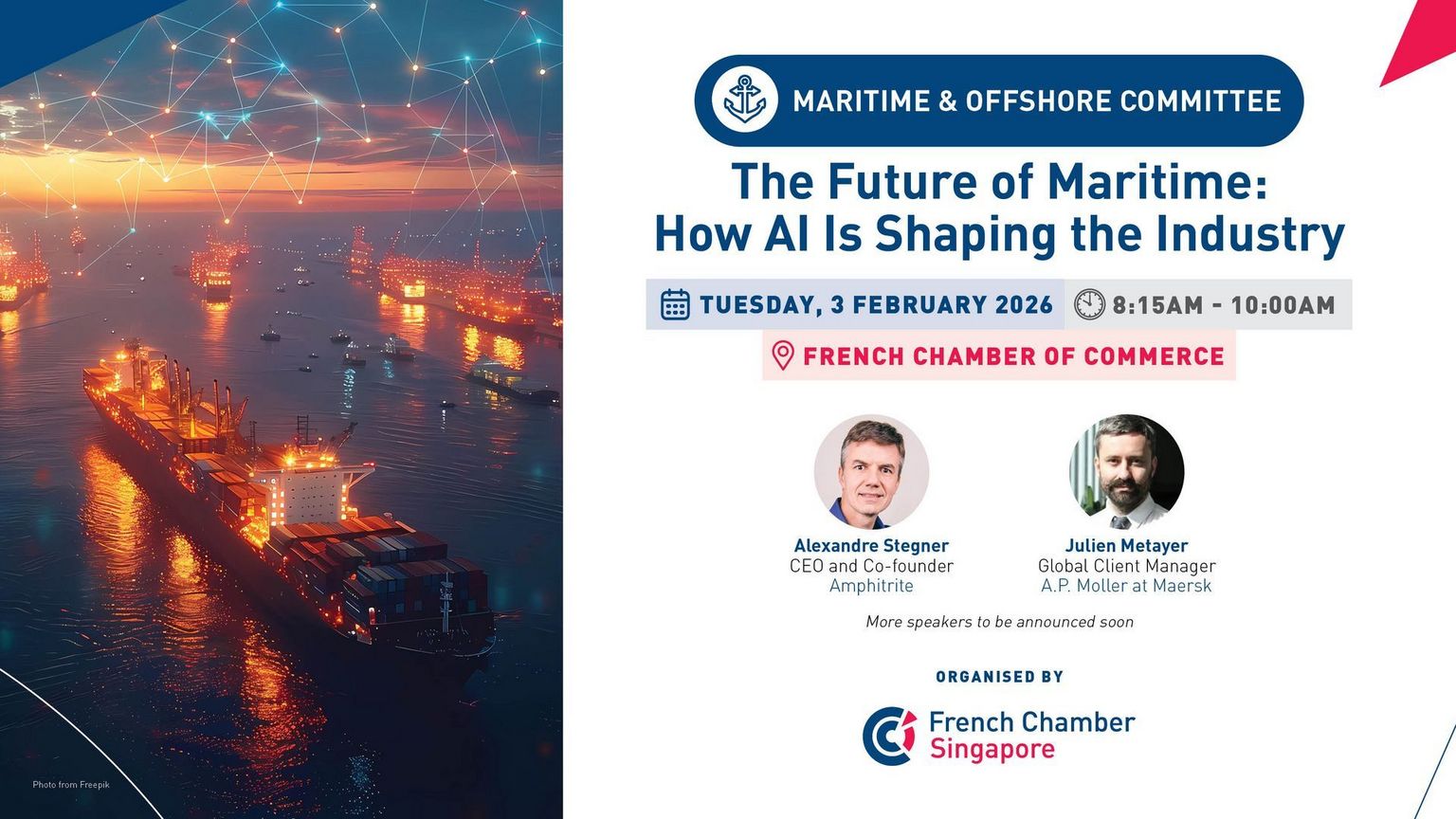 Artificial Intelligence is rapidly transforming the maritime sector, enabling new ways to optimise operations, improve safety, and enhance decision-making across the value chain. This breakfast talk will explore how AI technologies are being applied to address today’s maritime challenges, from route optimisation and predictive analytics to risk management and operational efficiency.