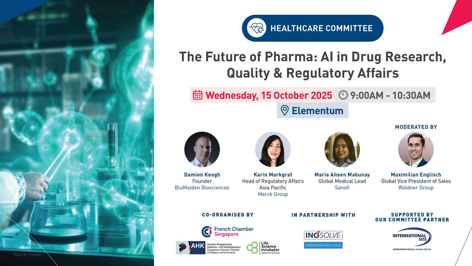 This event, co-organised by The French Chamber of Commerce, The Singaporean-German Chamber of Industry and Commerce and Life Science Incubator, will bring together experts across R&D, manufacturing, and regulatory affairs to explore how AI is being used to drive innovation, ensure compliance, and improve patient outcomes.