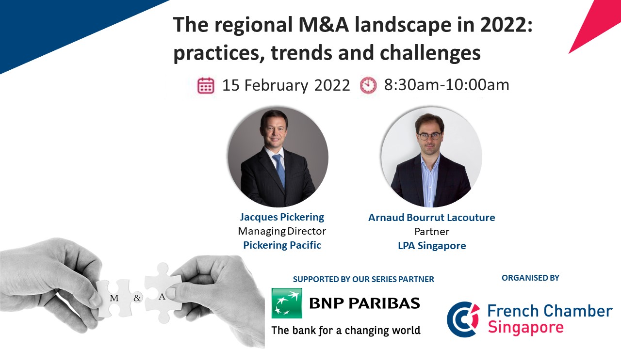 Jacques Pickering, from Pickering Pacific, a corporate finance advisory firm, together with Arnaud Bourrut Lacouture, from LPA SINGAPORE, a boutique law firm, member of LPA-CGR international network, will be discussing how the M&A landscape might look like for the next few months and beyond from the practical, financial, and legal points of view.
