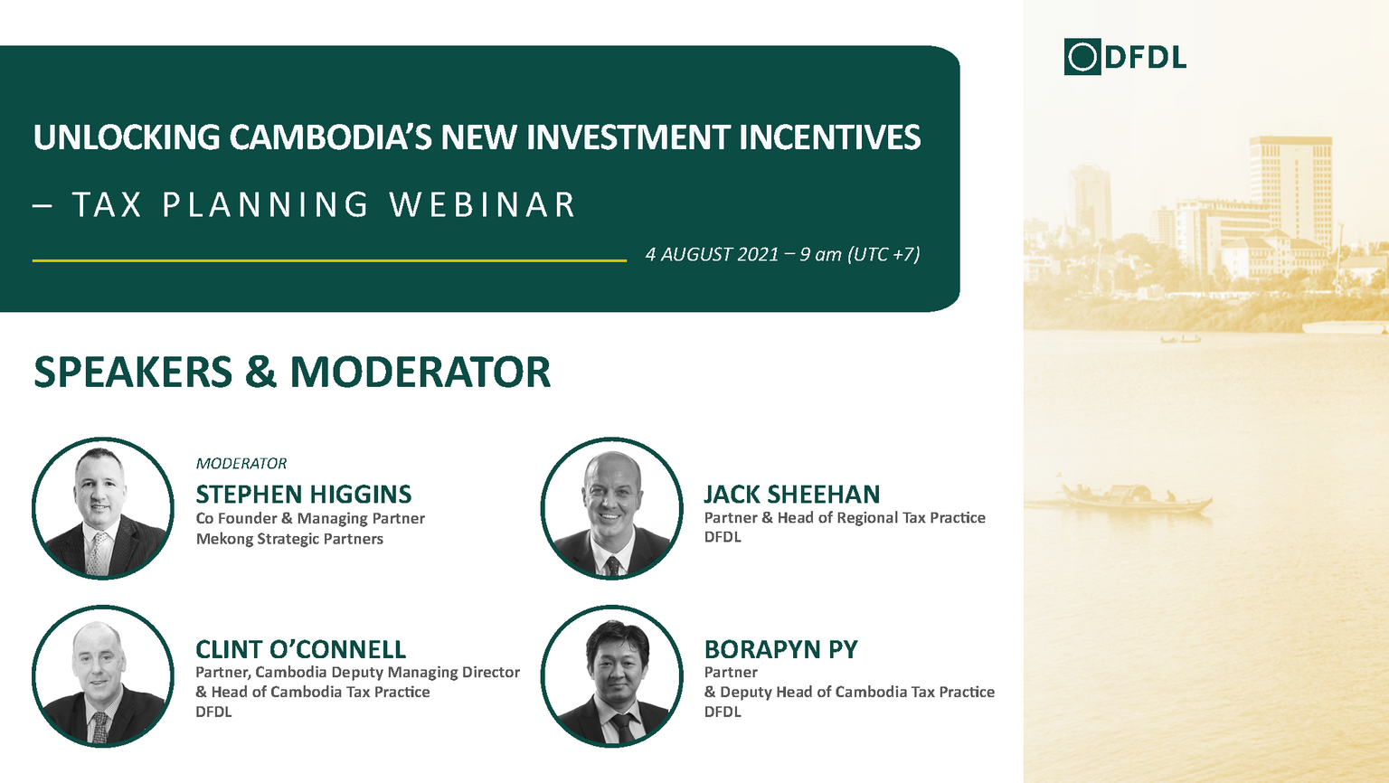 Register now at https://www.dfdl.com/resources/upcoming-events/unlocking-cambodias-new-investment-incentives-tax-planning-webinar-4-august-2021/