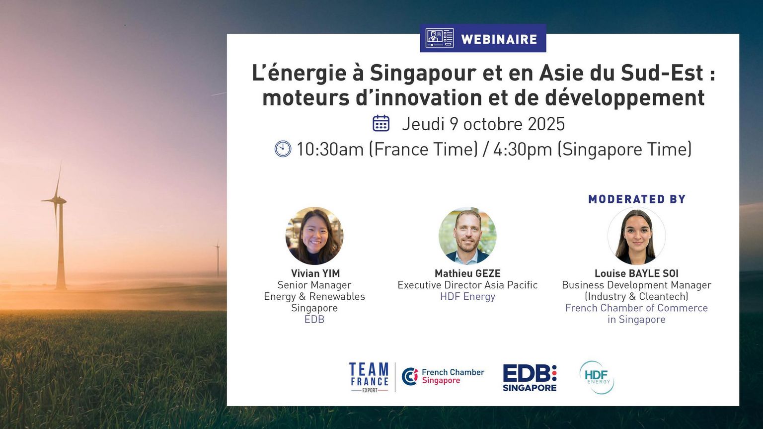 Organisé par la Team France Export de la Chambre de Commerce Française de Singapour, en partenariat avec l’Economic Development Board (EDB) de Singapour, ce webinaire mettra en lumière les leviers d’innovation et de développement énergétique dans l’une des régions les plus dynamiques du monde.