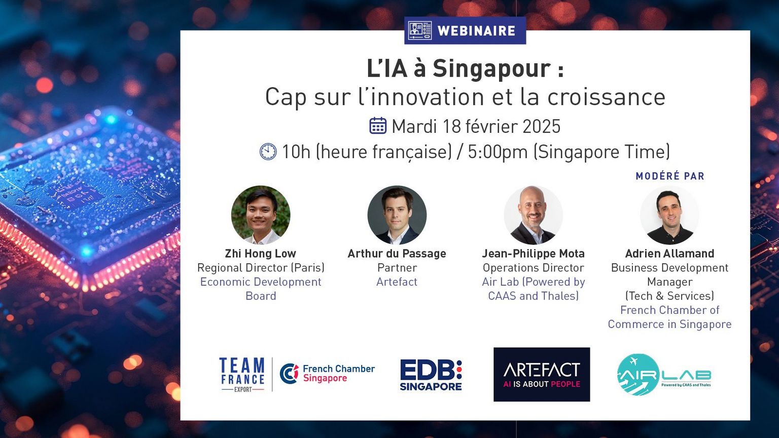 Nous aurons le plaisir d’accueillir Zhi Hong Low, directeur régional de l'Economic Development Board de Singapour, pour une présentation du marché singapourien. Il sera accompagné d'Arthur du Passage, partner chez Artefact et Jean-Philippe Mota, operations director chez Air Lab (développé par CAAS et Thales) qui apporteront leurs expertises à travers des témoignages. Le webinaire sera modéré par Adrien Allamand, Business Development Manager (Tech & Services), à la Chambre de Commerce Française de Singapour.