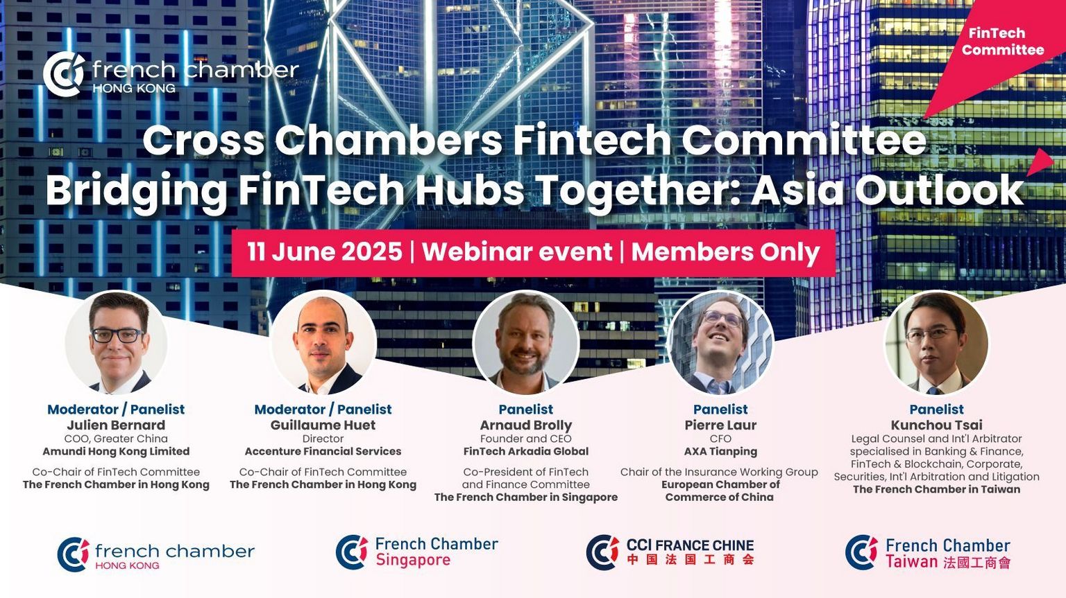 Join us for an insightful online panel featuring industry leaders Guillaume Huet from Accenture, Julien Bernard from Amundi, Arnaud Brolly from Fintech Arkadia Global, and Kunchou Tsai, Legal Counsel, as they explore the unique characteristics of FinTech across Asia.
