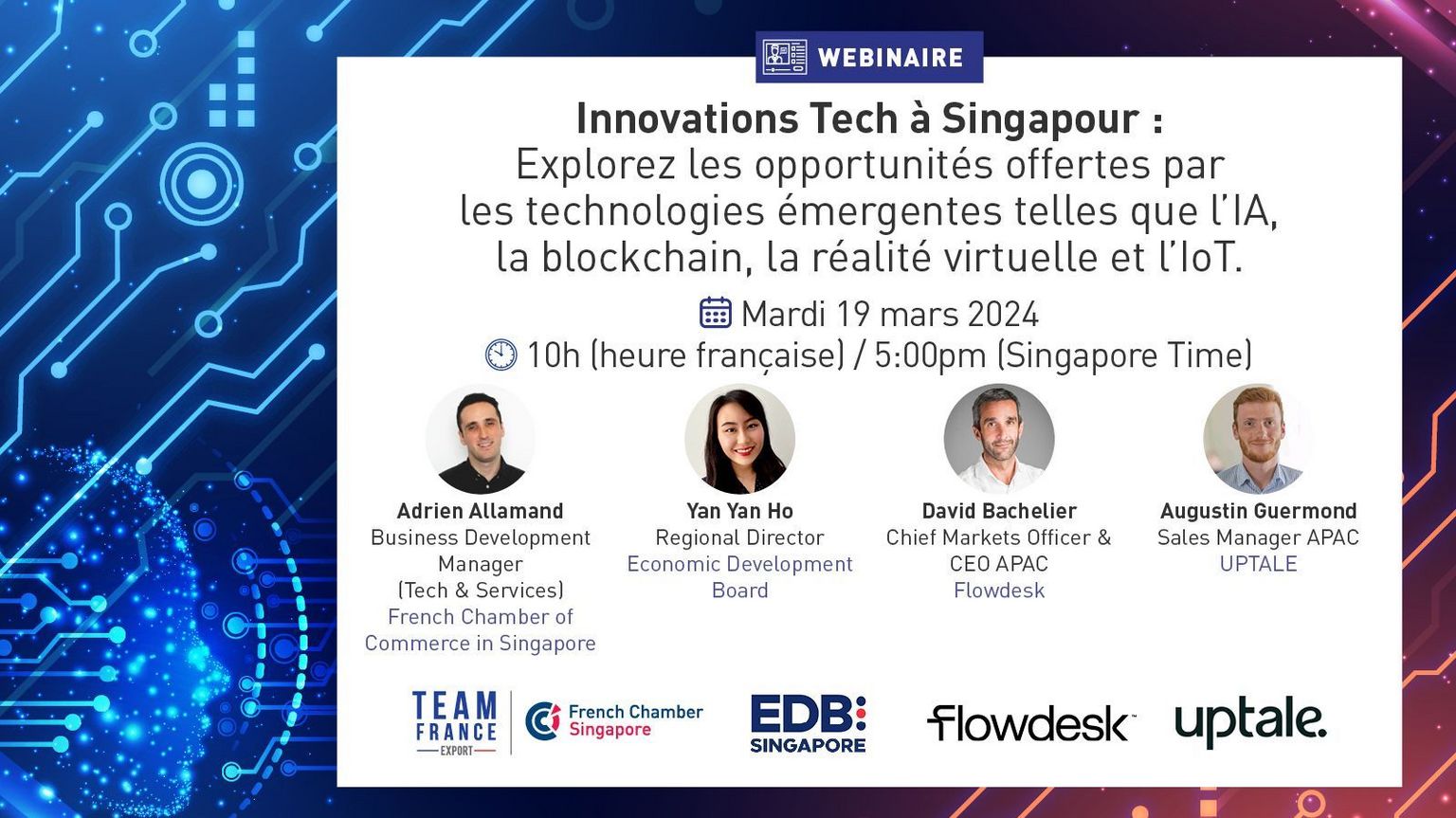 Au cours de ce webinaire, découvrez en détail ces opportunités avec une présentation sur le marché tech singapourien d'Adrien Allamand, Business Development Manager (Tech&Services) de la Chambre de Commerce française de Singapour, et d' Yan Yan Ho, Directrice Régionale de l'Economic Development Board de Singapour (EDB) , suivie de témoignages de David Bachelier de Flowdesk, et d’ Augustin Guermond d’Uptale..