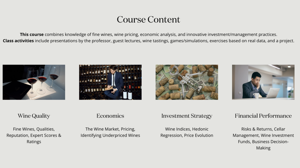 This course combines knowledge of fine wines, wine pricing, economic analysis, and innovative investment/management practices.