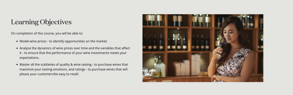 The wine market has evolved considerably over the last two decades, and it offers more opportunities today than ever before. This unique course will help you find and exploit these opportunities using solid skills to get the most out of wine investments. It will allow you to: