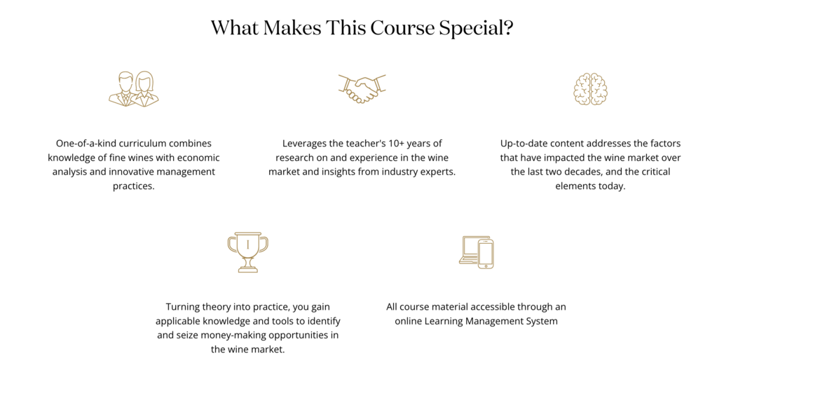 This course combines knowledge of fine wines, wine pricing, economic analysis, and innovative investment/management practices.