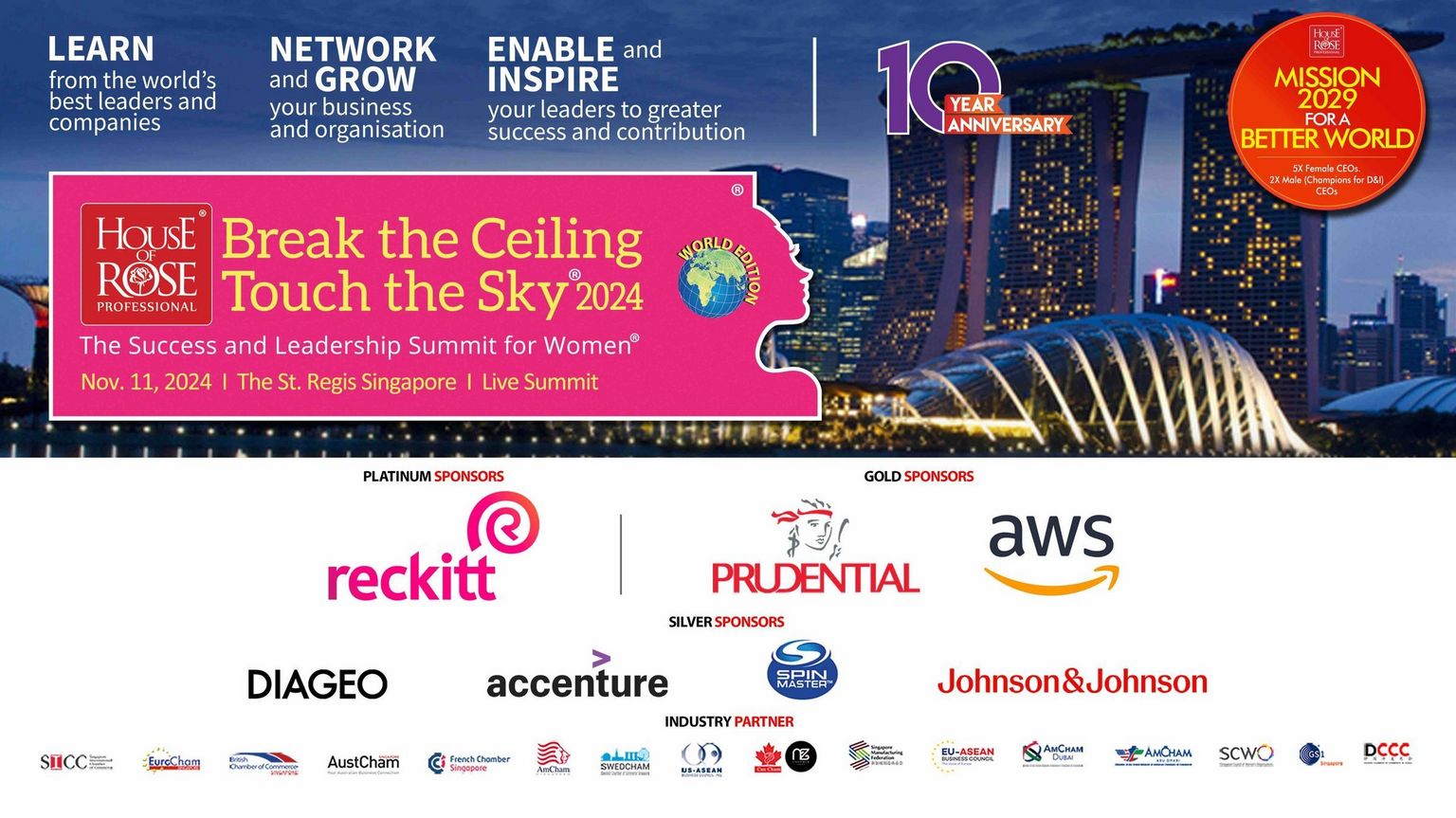 This is the 10th annual world edition of the summit to be held in Singapore and the 37th international edition of Break the ceiling touch the sky® and brings together in-person the world’s best leaders (especially female leaders across functions and levels) from the most successful organizations to share best practices for leadership, diversity, equity & inclusion (especially gender equality) and success. The summit is an excellent opportunity to learn from the best practices of the world’s best companies and leaders across business categories and support and inspire your teams to greater success and contribution. Specifically, it equips women leaders in particular with the tools and experiences needed to progress towards more senior leadership positions and enables organizations to accelerate their journey on gender diversity & inclusion.