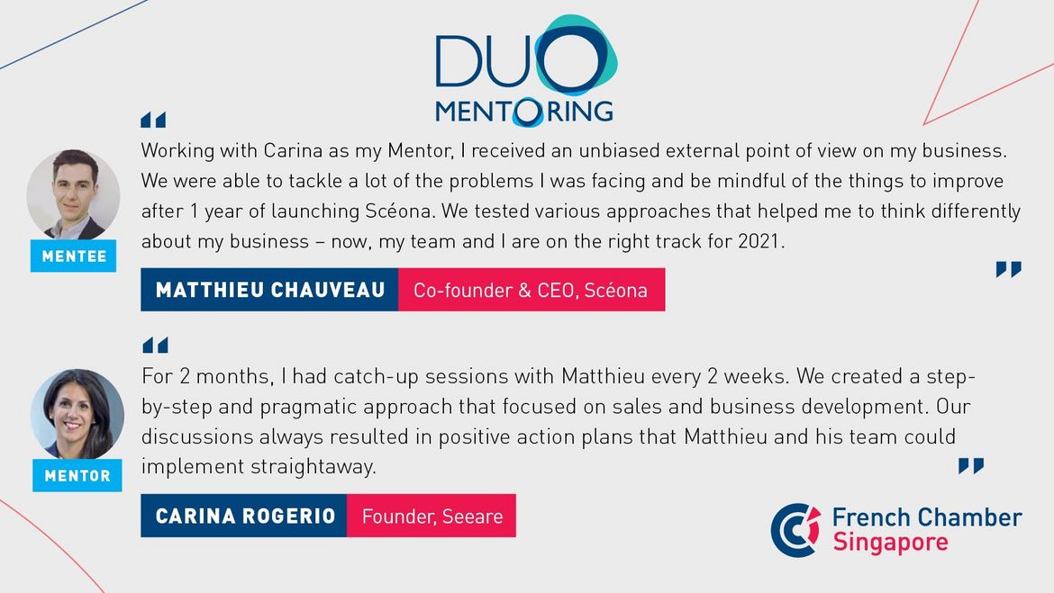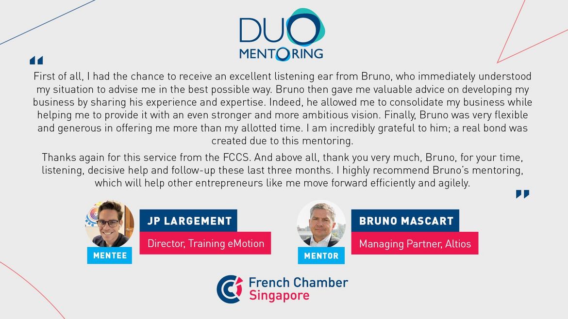 Le Duo Mentoring Programme, co-initié avec les Conseillers du Commerce Extérieur de la France, est une opportunité offerte aux startups, entrepreneurs et PME qui souhaitent développer leur activité dans la région de se rencontrer, d'échanger des idées et d'apprendre d'un mentor (chef d'entreprise ou cadre supérieur expérimenté).