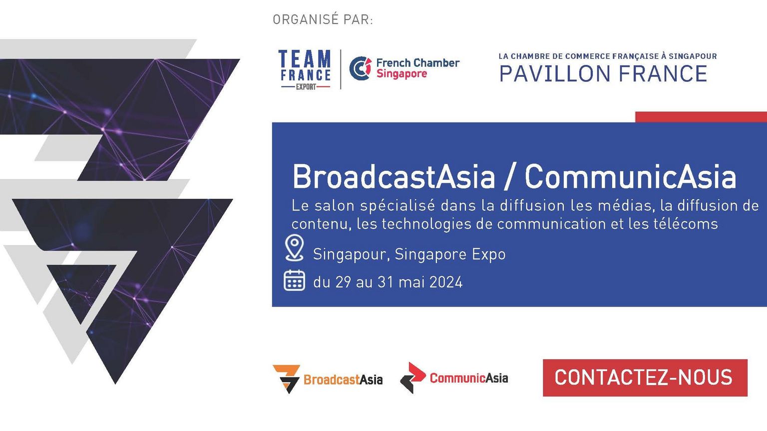 This year again, the French Chamber of Commerce in Singapore - Team France Export is going big with 2 Pavilions France: one French Pavilion at BroadCast Asia and one at CommunicAsia from May 29th to 31st May at Singapore EXPO exhibition centre.
